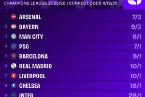 體育資訊12月11日訊 歐冠聯(lián)賽階段第6輪比賽戰(zhàn)罷,相關(guān)機構(gòu)列出了各隊奪冠的賠率,阿森納居首。