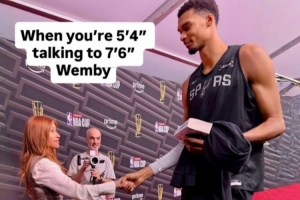 NBA女記者Rachel Nichols曬出了與文班握手照,配文:“當(dāng)1米63的你和2.32的文班(實(shí)為2米24)對(duì)話。”