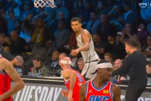 GIF-文班亞馬面對卡魯索干擾打進中距離 然后回頭手指著對手振振有詞