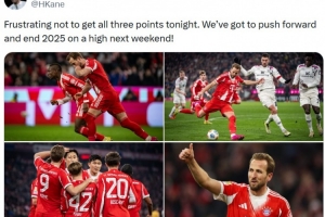本場(chǎng)比賽凱恩點(diǎn)射破門(mén),賽后他在社媒鼓勵(lì)球隊(duì)寫(xiě)道:“很失望今晚未能全取三分,我們必須全力以赴并在下周比賽中為今年完美收官。”