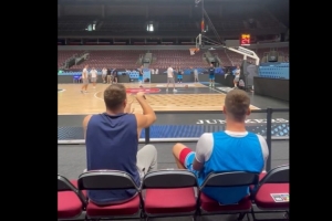 體育資訊9月10日訊 斯洛文尼亞男籃將在明天凌晨2點對陣德國男籃,斯洛文尼亞男籃官方社媒曬出了一個東契奇坐在替補席命中超遠三分的視頻,這手感真是無敵。