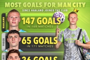 哈蘭德加盟曼城后球隊(duì)進(jìn)球榜: