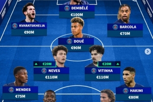 前鋒:克瓦拉茨赫利亞(巴黎圣日耳曼,9000萬(wàn))、奧斯曼·登貝萊(巴黎圣日耳曼,1億)、巴爾科拉(巴黎圣日耳曼,7000萬(wàn))