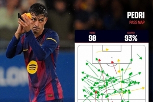 西甲官方社媒曬出佩德里此役的傳球路線圖,他傳球98次,關(guān)鍵傳球4次,傳球成功率93%。