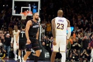 3、最后3秒,經(jīng)教練挑戰(zhàn)后回看復(fù)核,判定對(duì)布克的三分犯規(guī)吹罰無(wú)誤。布克在詹姆斯起跳舉球出手時(shí),主動(dòng)接觸其右臂/手腕部位。