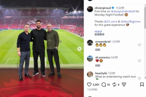 體育資訊12月16日訊 吉魯更新社媒動態(tài),曬出與卡拉格、大衛(wèi)·瓊斯(天空體育主持人)的合照。