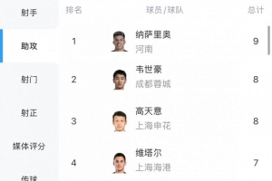 體育資訊9月22日訊 中超第25輪昨晚結(jié)束,助攻榜方面,本輪貢獻一次助攻的河南隊外援納薩里奧9次登頂,韋世豪、高天意8次。
