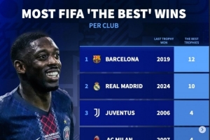 體育資訊12月17日訊 FIFA年度頒獎(jiǎng)典禮結(jié)束,登貝萊獲FIFA年度最佳球員,德轉(zhuǎn)列各俱樂部球員獲FIFA年度最佳球員次數(shù),巴薩12次居首,皇馬10次第二,尤文、米蘭、國(guó)米、巴黎4次并列第三。