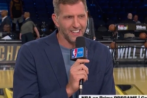 體育資訊12月17日訊 NBA杯決賽,馬刺vs尼克斯。諾維茨基擔任現(xiàn)場解說嘉賓。
