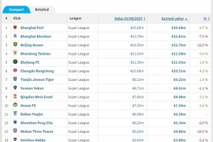 俱樂部身價方面,上海海港以1608萬歐元排在全聯(lián)賽第一,上海申花以1281萬歐元排第二,北京國安以1276萬歐元排第三,山東泰山以1158萬歐元排第四,浙江以1155萬歐元排第五,成都蓉城以1051萬歐元排第六,其余球隊(duì)均低于1000萬歐元。