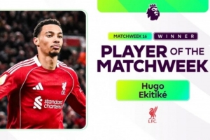 體育資訊12月17日訊 英超官方消息,利物浦前鋒埃基蒂克被評(píng)為聯(lián)賽第16輪最佳球員。