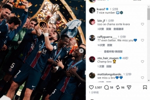 在巴黎身披7號的克瓦拉茨赫利亞社媒曬出捧杯照片,慶祝球隊(duì)奪冠,配文:“7是不錯(cuò)的數(shù)字。”