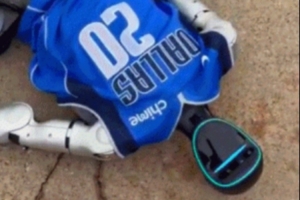 視頻中一個穿著獨行俠球衣的機器人正在施展回旋踢等招數(shù),歐文溜過來使勁推了一把,機器人應(yīng)聲倒地沒了動靜。
