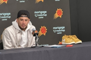 賽后,布克帶著庫里賽前熱身親穿的Book1球鞋(布克的簽名球鞋)參加了新聞發(fā)布會(huì)。鞋子的上面有庫里的親筆簽名及寄語。