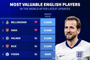 英格蘭球員最新身價榜:歐元