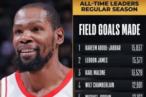 本場比賽,杜蘭特生涯運動戰(zhàn)進球數(shù)超過奧拉朱旺(10749),升至歷史第10位。
