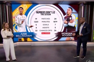 里奧·科克說:說實話,這兩人都是頂級球員。從數(shù)據(jù)上看,確實非常相近。當(dāng)然,不同之處在于人們會說貝林厄姆效力的是皇家馬德里這樣的一家頂級豪門,而摩根·羅杰斯是在阿斯頓維拉證明自己。