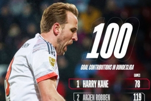 拜仁官方社媒曬出德甲聯(lián)賽中達成參與100球所需場次榜單,其中凱恩78場居首。