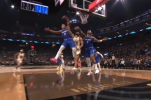 GIF-庫里上籃被包夾撞飛 裁判沒有表示
