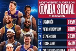 體育資訊12月24日訊 今天,NBA官方曬出了本賽季NBA社交媒體平臺(tái)上觀看次數(shù)最多的10位球員,其中9位將在圣誕節(jié)當(dāng)天亮相,詳情如下: