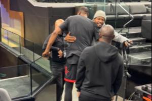 賽前,比爾與杜蘭特?fù)肀е乱猓瑑扇嗽谔栕鲞^隊友。