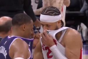 GIF-威少賽后和康寧漢姆寒暄許久 還用衣服擋住嘴