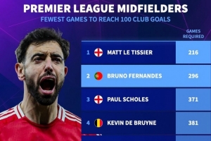據(jù)德國轉(zhuǎn)會市場統(tǒng)計(jì),B費(fèi)已為曼聯(lián)打進(jìn)100球,英超時(shí)代只有8名中場球員為俱樂部(所有賽事)打進(jìn)100球,而B費(fèi)是所用場次第2少的中場球員。