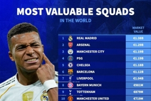 體育資訊12月25日訊 德轉(zhuǎn)更新各聯(lián)賽球員身價(jià),并列出了俱樂部身價(jià)排名,皇馬13.8億歐居首,阿森納、曼城前三。