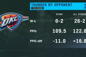 雷霆本賽季對陣馬刺戰(zhàn)績0-2,場均僅109.5分,場均凈負11分