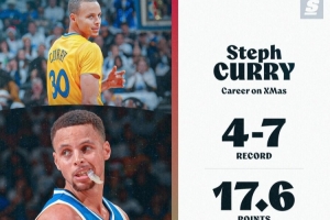 據(jù)統(tǒng)計,庫里生涯至今共出戰(zhàn)11次圣誕大戰(zhàn),戰(zhàn)績?yōu)?勝7負,期間場均可以得到17.6分6.4助攻,三分命中率僅28%。