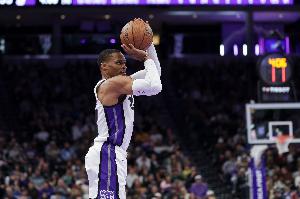 威少目前生涯總得分26638分,再得73分,他將超越大O(26710分),成為控衛(wèi)歷史得分王。