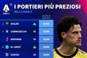 體育資訊12月25日訊 德國轉(zhuǎn)會市場列出意甲門將身價排名,斯維拉爾3500萬歐居首。