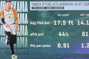 文班在場時,雷霆的平均出手距離是17.5英尺(約5.3米)、而他不在場時出手距離平均是14.1英尺(約4.3米)。文班在場時,雷霆的有效命中率僅為44%,他不在場時是61%。文班在場時,雷霆每回合得分為0.91分,他不在場時是1.24分。