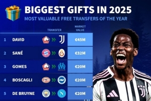 體育資訊12月26日訊 德國轉(zhuǎn)會(huì)市場統(tǒng)計(jì)了2025年自由身轉(zhuǎn)會(huì)球員的身價(jià),并列出榜單,戴維4500萬歐居首。