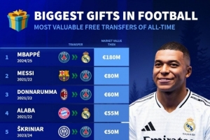 體育資訊12月26日訊 德國轉(zhuǎn)會(huì)市場統(tǒng)計(jì)了足壇歷史免簽球員的身價(jià),并列出榜單,姆巴佩1.8億歐居首,梅西8000萬歐次席。