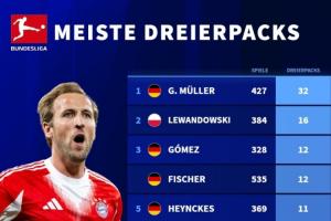 體育資訊09月23日訊 德轉(zhuǎn)統(tǒng)計了德甲歷史帽子戲法榜,蓋德穆勒32次帽子戲法斷層領先,凱恩僅用67場就排在歷史第7。
