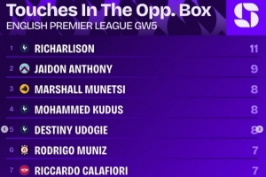 體育資訊9月24日訊 英超第5輪戰(zhàn)罷,squawkafootball列各項(xiàng)數(shù)據(jù)排行,熱刺前鋒理查利森是本輪在對方禁區(qū)觸球最多的球員,共11次。