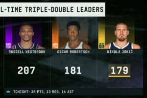 這樣一來,他職業(yè)生涯的三雙總數(shù)來到179次,距離歷史第二多的“大O”奧斯卡·羅伯特森只差兩場,距離歷史第一的威少還差28場。