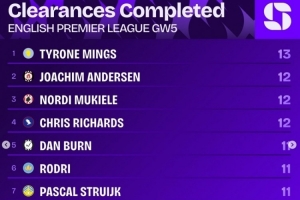 體育資訊9月24日訊 英超第5輪戰(zhàn)罷,squawkafootball列各項數(shù)據(jù)排行,維拉后衛(wèi)明斯是本輪解圍最多的球員,共13次。