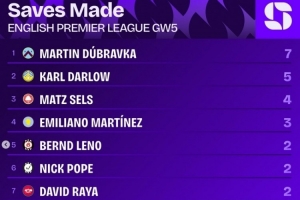 體育資訊9月24日訊 英超第5輪戰(zhàn)罷,squawkafootball列各項(xiàng)數(shù)據(jù)排行,伯恩利門將杜布拉夫卡是本輪撲救次數(shù)最多的門將,共有7次。