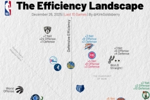 體育資訊12月27日訊 今天,美媒Kirk Goldsberry曬圖統(tǒng)計(jì)了NBA過(guò)去10場(chǎng)比賽所有球隊(duì)的攻防效率,詳情入下: