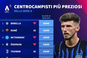 體育資訊12月27日訊 德國轉會市場統(tǒng)計了意甲中場中路球員的身價,并列出榜單,巴雷拉6000萬歐居首。