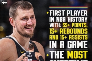 本場,約基奇出戰(zhàn)43分鐘,投籃21中15,三分6中4,罰球23中22,砍下56分16籃板15助攻2蓋帽,正負值+15!