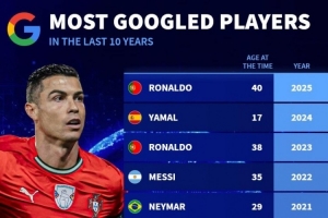 體育資訊12月27日訊 《轉會市場》根據(jù)谷歌搜索列出了近10年的年度被搜索次數(shù)最多的足球運動員,C羅共計6次登頂。
