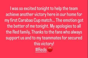 賽后,埃基蒂克在社媒向利物浦球迷道歉:“今晚能首次參加聯(lián)賽杯主場(chǎng)賽事并幫助球隊(duì)再奪勝利,我無(wú)比激動(dòng)……但今夜情緒確實(shí)有些失控。在此向所有紅軍大家庭致歉,也感謝一直支持我們的球迷,以及攜手贏下比賽的隊(duì)友們!”
