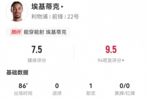 體育資訊12月28日訊 利物浦在本輪英超對(duì)陣?yán)顷?duì),埃基蒂克本場數(shù)據(jù)如下: