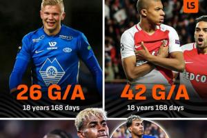 18歲的哈蘭德當(dāng)時還在挪威的莫爾德效力,他18歲168天時在職業(yè)賽場上的直接參與進球數(shù)為26球;同齡的姆巴佩正在摩納哥效力,他當(dāng)時的直接參與進球數(shù)為42球。