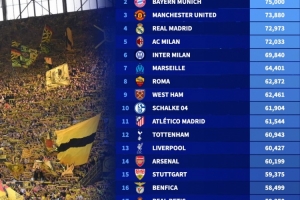 體育資訊12月29日訊 德轉發(fā)布2025年歐洲俱樂部場均上座率排行,多特第一、拜仁第二、曼聯(lián)第三。