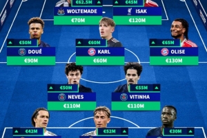 中場:杜埃(巴黎,+5000萬,9000萬)、卡爾(拜仁,+6000萬,6000萬)、奧利塞(拜仁,+6500萬,1.3億)、若昂·內(nèi)維斯(巴黎,+5000萬,1.1億)、維蒂尼亞(巴黎,+5500萬,1.1億)