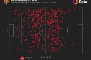 體育資訊12月29日訊 2025年即將結(jié)束,opta數(shù)據(jù)統(tǒng)計顯示佩德里是本年度奪回球權(quán)次數(shù)最多的五大聯(lián)賽非門將球員。